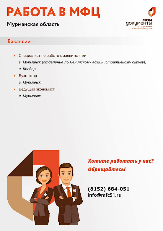 Уважаемые соискатели! Резюме просим направлять по электронной почте: info@mfc51.ru